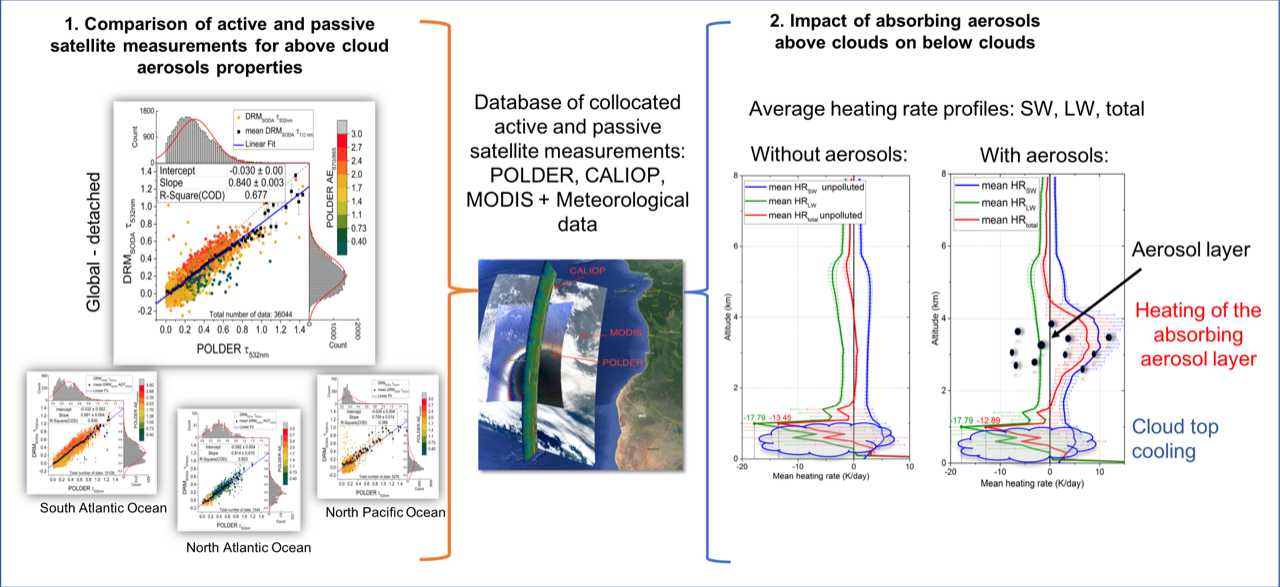 Deaconu L., Waquet F., Josset D., Ferlay N., Pascal N., Peers, F., Ducos F., Thieuleux F., Tanré D., Pelon J., Goloub P.: Consistency of aerosols above clouds characterization from active and passive A-Train sensors, A-Train Symposium, 18-23 April 2017, Pasadena, California.