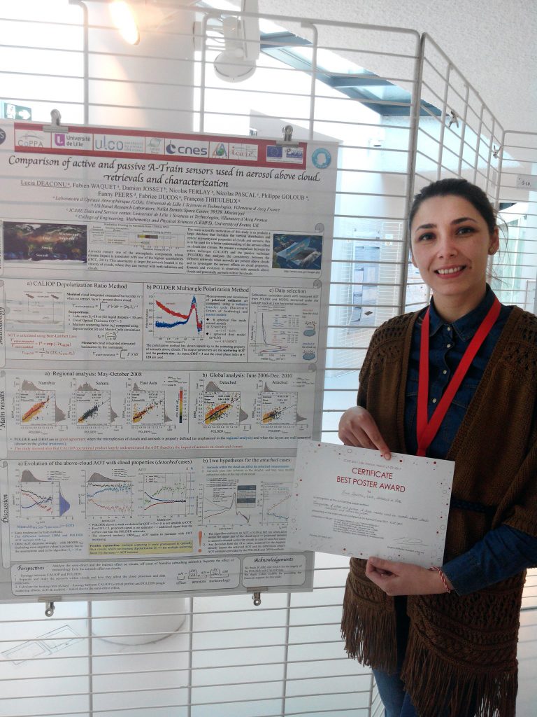 Best poster: Deaconu L., Waquet F., Josset D., Ferlay N., Pascal N., Goloub P., Peers, F., Ducos F., Thieuleux F., Comparison of active and passive A-Train sensors used in aerosols above clouds retrievals and characterization, ICAC Conference, 23-27 March 2017, Villeneuve d’Ascq, France